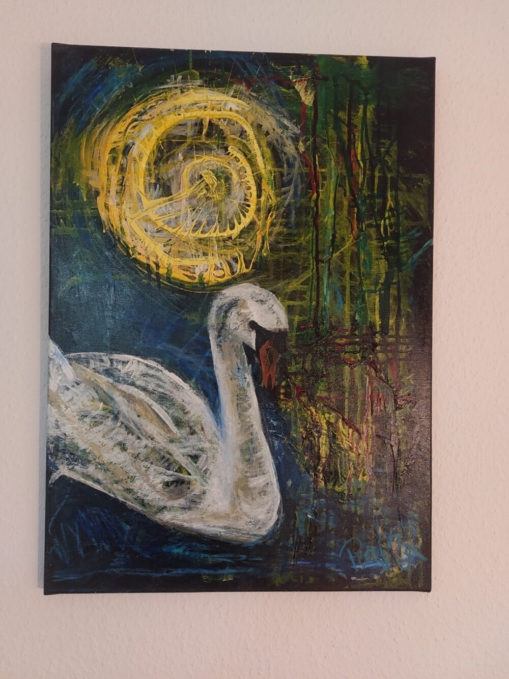 In diesem Werk habe ich die Kraft des Gefühls eingefangen, das sich in wirbelnden Farben und der mystischen Präsenz des Schwans ausdrückt. Der helle, spiralartige Kreis symbolisiert Leben und Energie, während das Dunkel im Hintergrund Spannung und Tiefe schafft. Dieses Bild bringt eine dynamische, ruhige Kraft in jeden Raum – ein lebendiger Dialog zwischen Licht und Schatten, Bewegung und Stille.